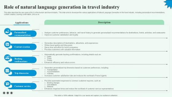 This slide describes the use cases of NLG in the tourism and travel industry. This slide aims to showcase the various applications of Natural Language Generation in the travel industry, including personalized recommendations, content creation, booking confirmation, and so on. Do you have an important presentation coming up Are you looking for something that will make your presentation stand out from the rest Look no further than Role Of Natural Language Automated Content Generation PPT PowerPoint. With our professional designs, you can trust that your presentation will pop and make delivering it a smooth process. And with Slidegeeks, you can trust that your presentation will be unique and memorable. So why wait Grab Role Of Natural Language Automated Content Generation PPT PowerPoint today and make your presentation stand out from the rest This slide describes the use cases of NLG in the tourism and travel industry. This slide aims to showcase the various applications of Natural Language Generation in the travel industry, including personalized recommendations, content creation, booking confirmation, and so on.