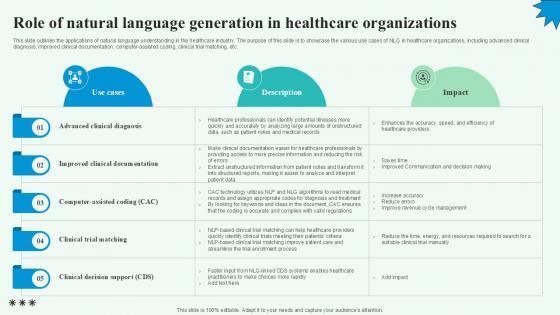 This slide outlines the applications of natural language understanding in the healthcare industry. The purpose of this slide is to showcase the various use cases of NLG in healthcare organizations, including advanced clinical diagnosis, improved clinical documentation, computer-assisted coding, clinical trial matching, etc. Whether you have daily or monthly meetings, a brilliant presentation is necessary. Role Of Natural Language Generation Automated Content Generation PPT Example can be your best option for delivering a presentation. Represent everything in detail using Role Of Natural Language Generation Automated Content Generation PPT Example and make yourself stand out in meetings. The template is versatile and follows a structure that will cater to your requirements. All the templates prepared by Slidegeeks are easy to download and edit. Our research experts have taken care of the corporate themes as well. So, give it a try and see the results. This slide outlines the applications of natural language understanding in the healthcare industry. The purpose of this slide is to showcase the various use cases of NLG in healthcare organizations, including advanced clinical diagnosis, improved clinical documentation, computer-assisted coding, clinical trial matching, etc.