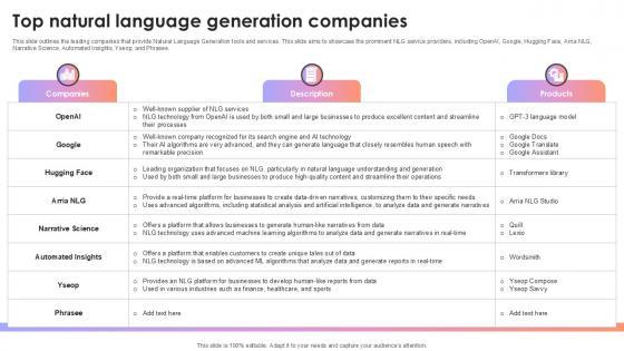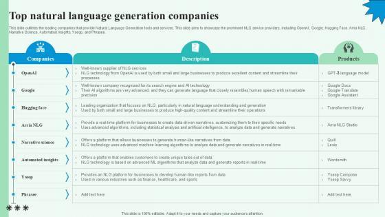 This slide outlines the leading companies that provide Natural Language Generation tools and services. This slide aims to showcase the prominent NLG service providers, including OpenAI, Google, Hugging Face, Arria NLG, Narrative Science, Automated Insights, Yseop, and Phrasee. Coming up with a presentation necessitates that the majority of the effort goes into the content and the message you intend to convey. The visuals of a PowerPoint presentation can only be effective if it supplements and supports the story that is being told. Keeping this in mind our experts created Top Natural Language Automated Content Generation PPT Template to reduce the time that goes into designing the presentation. This way, you can concentrate on the message while our designers take care of providing you with the right template for the situation. This slide outlines the leading companies that provide Natural Language Generation tools and services. This slide aims to showcase the prominent NLG service providers, including OpenAI, Google, Hugging Face, Arria NLG, Narrative Science, Automated Insights, Yseop, and Phrasee.