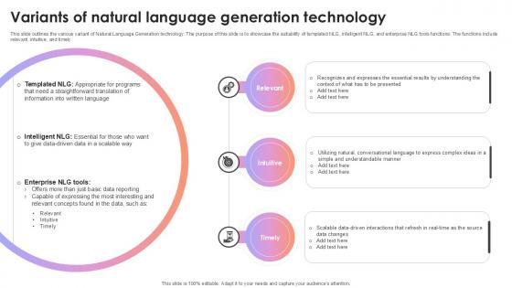 This slide outlines the various variant of Natural Language Generation technology. The purpose of this slide is to showcase the suitability of templated NLG, intelligent NLG, and enterprise NLG tools functions. The functions include relevant, intuitive, and timely. Welcome to our selection of the Variants Of Natural Language Automated Content Generation PPT Slide. These are designed to help you showcase your creativity and bring your sphere to life. Planning and Innovation are essential for any business that is just starting out. This collection contains the designs that you need for your everyday presentations. All of our PowerPoints are 100Percent editable, so you can customize them to suit your needs. This multi-purpose template can be used in various situations. Grab these presentation templates today. This slide outlines the various variant of Natural Language Generation technology. The purpose of this slide is to showcase the suitability of templated NLG, intelligent NLG, and enterprise NLG tools functions. The functions include relevant, intuitive, and timely.