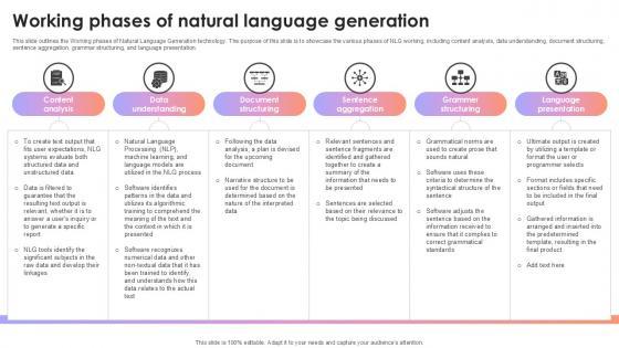 This slide outlines the Working phases of Natural Language Generation technology. The purpose of this slide is to showcase the various phases of NLG working, including content analysis, data understanding, document structuring, sentence aggregation, grammar structuring, and language presentation. The best PPT templates are a great way to save time, energy, and resources. Slidegeeks have 100 percent editable powerpoint slides making them incredibly versatile. With these quality presentation templates, you can create a captivating and memorable presentation by combining visually appealing slides and effectively communicating your message. Download Working Phases Of Natural Language Generation AI Content Creation It Ppt Presentation from Slidegeeks and deliver a wonderful presentation. This slide outlines the Working phases of Natural Language Generation technology. The purpose of this slide is to showcase the various phases of NLG working, including content analysis, data understanding, document structuring, sentence aggregation, grammar structuring, and language presentation.