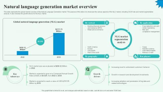 This slide represents the global market overview of the Natural Language Generation market. The purpose of this slide is to showcase the various aspects of the NLG market, including CAGR rate and market segmentation analysis. It also includes the growth drivers for the NLG market. Do you know about Slidesgeeks Natural Language Generation Market Overview PPT Presentation These are perfect for delivering any kind od presentation. Using it, create PowerPoint presentations that communicate your ideas and engage audiences. Save time and effort by using our pre-designed presentation templates that are perfect for a wide range of topic. Our vast selection of designs covers a range of styles, from creative to business, and are all highly customizable and easy to edit. Download as a PowerPoint template or use them as Google Slides themes. This slide represents the global market overview of the Natural Language Generation market. The purpose of this slide is to showcase the various aspects of the NLG market, including CAGR rate and market segmentation analysis. It also includes the growth drivers for the NLG market.
