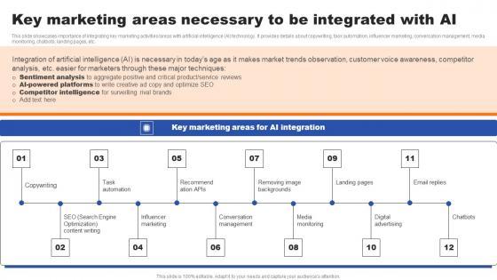 This slide showcases importance of integrating key marketing activities or areas with artificial intelligence AI technology. It provides details about copywriting, task automation, influencer marketing, conversation management, media monitoring, chatbots, landing pages, etc. Are you in need of a template that can accommodate all of your creative concepts This one is crafted professionally and can be altered to fit any style. Use it with Google Slides or PowerPoint. Include striking photographs, symbols, depictions, and other visuals. Fill, move around, or remove text boxes as desired. Test out color palettes and font mixtures. Edit and save your work, or work with colleagues. Download Key Marketing Areas Necessary To Be Integrated With AI Ppt Professional Example Pdf and observe how to make your presentation outstanding. Give an impeccable presentation to your group and make your presentation unforgettable. This slide showcases importance of integrating key marketing activities or areas with artificial intelligence AI technology. It provides details about copywriting, task automation, influencer marketing, conversation management, media monitoring, chatbots, landing pages, etc.