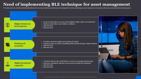This slide covers key benefits of implementing Bluetooth low energy method in asset tracking and management. It involves advantages such as high return on investment, enhanced security and high broadcast capacity. The Need Of Implementing Ble Technique For Asset RFID Solutions For Asset Traceability Clipart Pdf is a compilation of the most recent design trends as a series of slides. It is suitable for any subject or industry presentation, containing attractive visuals and photo spots for businesses to clearly express their messages. This template contains a variety of slides for the user to input data, such as structures to contrast two elements, bullet points, and slides for written information. Slidegeeks is prepared to create an impression. This slide covers key benefits of implementing Bluetooth low energy method in asset tracking and management. It involves advantages such as high return on investment, enhanced security and high broadcast capacity.