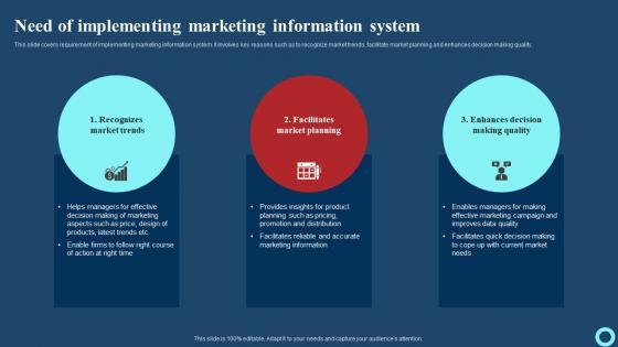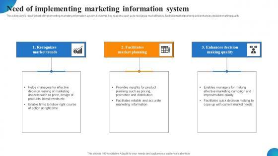 This slide covers requirement of implementing marketing information system. It involves key reasons such as to recognize market trends, facilitate market planning and enhances decision making quality. Do you have to make sure that everyone on your team knows about any specific topic I yes, then you should give Need Of Implementing Marketing Information System Clipart PDF a try. Our experts have put a lot of knowledge and effort into creating this impeccable Need Of Implementing Marketing Information System Clipart PDF. You can use this template for your upcoming presentations, as the slides are perfect to represent even the tiniest detail. You can download these templates from the Slidegeeks website and these are easy to edit. So grab these today