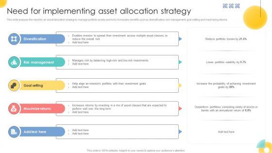This slide analyzes the need for an asset allocation strategy to manage portfolio assets and risks. It includes benefits such as diversification, risk management, goal setting and maximizing returns.This Need For Implementing Asset Allocation Strategy Strategic Investment Plan For Optimizing Risk SS V from Slidegeeks makes it easy to present information on your topic with precision. It provides customization options, so you can make changes to the colors, design, graphics, or any other component to create a unique layout. It is also available for immediate download, so you can begin using it right away. Slidegeeks has done good research to ensure that you have everything you need to make your presentation stand out. Make a name out there for a brilliant performance. This slide analyzes the need for an asset allocation strategy to manage portfolio assets and risks. It includes benefits such as diversification, risk management, goal setting and maximizing returns.