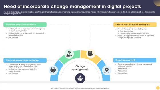 The given slide showcases details related to need of incorporating structured approach for planning, implementing, and sustaining changes with minimal disruptions at project level. It includes details related to need to incorporate change management, etc. Welcome to our selection of the Digital Project Management Strategies Need Of Incorporate Change Management In Digital Projects. These are designed to help you showcase your creativity and bring your sphere to life. Planning and Innovation are essential for any business that is just starting out. This collection contains the designs that you need for your everyday presentations. All of our PowerPoints are 100Percent editable, so you can customize them to suit your needs. This multi-purpose template can be used in various situations. Grab these presentation templates today. The given slide showcases details related to need of incorporating structured approach for planning, implementing, and sustaining changes with minimal disruptions at project level. It includes details related to need to incorporate change management, etc.