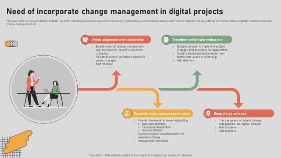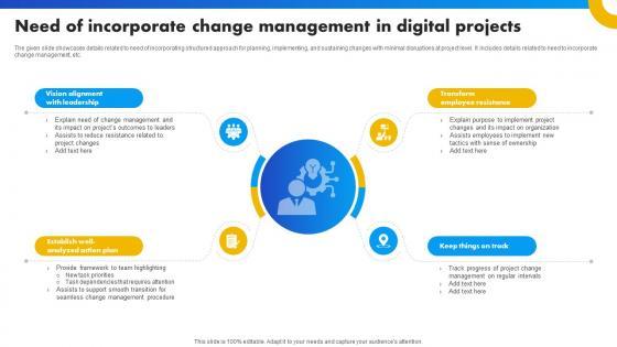 The given slide showcases details related to need of incorporating structured approach for planning, implementing, and sustaining changes with minimal disruptions at project level. It includes details related to need to incorporate change management, etc. Explore a selection of the finest Need Of Incorporate Change Management In Digital Transformation In Project Management here. With a plethora of professionally designed and pre-made slide templates, you can quickly and easily find the right one for your upcoming presentation. You can use our Need Of Incorporate Change Management In Digital Transformation In Project Management to effectively convey your message to a wider audience. Slidegeeks has done a lot of research before preparing these presentation templates. The content can be personalized and the slides are highly editable. Grab templates today from Slidegeeks. The given slide showcases details related to need of incorporating structured approach for planning, implementing, and sustaining changes with minimal disruptions at project level. It includes details related to need to incorporate change management, etc.