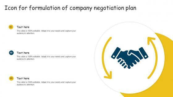 Pitch your topic with ease and precision using this Icon For Formulation Of Company Negotiation Plan Formats Pdf This layout presents information on Icon Formulation, Company Negotiation Plan It is also available for immediate download and adjustment. So, changes can be made in the color, design, graphics or any other component to create a unique layout. Our Icon For Formulation Of Company Negotiation Plan Formats Pdf are topically designed to provide an attractive backdrop to any subject. Use them to look like a presentation pro.