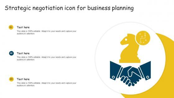 Pitch your topic with ease and precision using this Strategic Negotiation Icon For Business Planning Sample Pdf This layout presents information on Strategic Negotiation Icon, Business Planning It is also available for immediate download and adjustment. So, changes can be made in the color, design, graphics or any other component to create a unique layout. Our Strategic Negotiation Icon For Business Planning Sample Pdf are topically designed to provide an attractive backdrop to any subject. Use them to look like a presentation pro.