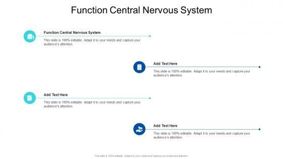 Presenting our innovatively designed set of slides titled Function Central Nervous System In Powerpoint And Google Slides Cpb. This completely editable PowerPoint graphic exhibits Function Central Nervous System that will help you convey the message impactfully. It can be accessed with Google Slides and is available in both standard screen and widescreen aspect ratios. Apart from this, you can download this well structured PowerPoint template design in different formats like PDF, JPG, and PNG. So, click the download button now to gain full access to this PPT design. Our Function Central Nervous System In Powerpoint And Google Slides Cpb are topically designed to provide an attractive backdrop to any subject. Use them to look like a presentation pro.