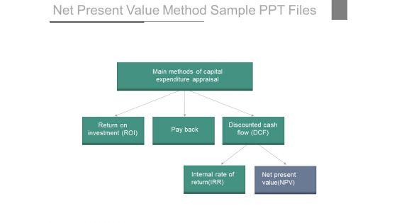 This is a net present value method sample ppt files. This is a one stage process. The stages in this process are main methods of capital expenditure appraisal, return on investment roi, pay back, discounted cash flow dcf, internal rate of return irr, net present value npv.