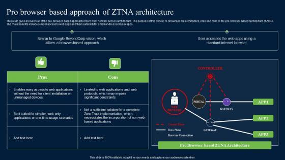 This slide gives an overview of the pro-browser-based approach of zero trust network access architecture. The purpose of this slide is to showcase the architecture, pros and cons of the pro-browser-based architecture of ZTNA. The main benefits include simpler access to web apps and their suitability for small and less complex apps. There are so many reasons you need a Zero Trust Network Access Pro Browser Based Approach Of ZTNA Architecture. The first reason is you can not spend time making everything from scratch, Thus, Slidegeeks has made presentation templates for you too. You can easily download these templates from our website easily. This slide gives an overview of the pro-browser-based approach of zero trust network access architecture. The purpose of this slide is to showcase the architecture, pros and cons of the pro-browser-based architecture of ZTNA. The main benefits include simpler access to web apps and their suitability for small and less complex apps.