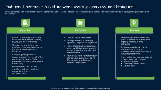 This slide represents the overview of traditional perimeter-based network security. The purpose of this slide is to showcase the various challenges of conventional perimeter-based security and how ZTNA can overcomethose challenges. This Zero Trust Network Access Traditional Perimeter Based Network Security Overview And Limitations is perfect for any presentation, be it in front of clients or colleagues. It is a versatile and stylish solution for organizing your meetings. The Zero Trust Network Access Traditional Perimeter Based Network Security Overview And Limitations features a modern design for your presentation meetings. The adjustable and customizable slides provide unlimited possibilities for acing up your presentation. Slidegeeks has done all the homework before launching the product for you. So, do not wait, grab the presentation templates today This slide represents the overview of traditional perimeter-based network security. The purpose of this slide is to showcase the various challenges of conventional perimeter-based security and how ZTNA can overcomethose challenges.
