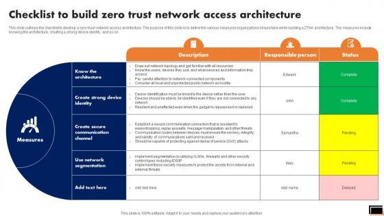 This slide outlines the checklist to develop a zero-trust network access architecture. The purpose of this slide is to define the various measures organizations should take while building a ZTNA architecture. The measures include knowing the architecture, creating a strong device identity, and so on. Coming up with a presentation necessitates that the majority of the effort goes into the content and the message you intend to convey. The visuals of a PowerPoint presentation can only be effective if it supplements and supports the story that is being told. Keeping this in mind our experts created Zero Trust Network Access Checklist To Build Zero Trust Network Access Architecture to reduce the time that goes into designing the presentation. This way, you can concentrate on the message while our designers take care of providing you with the right template for the situation. This slide outlines the checklist to develop a zero-trust network access architecture. The purpose of this slide is to define the various measures organizations should take while building a ZTNA architecture. The measures include knowing the architecture, creating a strong device identity, and so on.