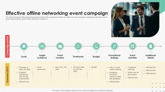 This slide showcases offline networking event examples for the sales team to attract key influencers and companies, including key elements such as goals, target audience, event location, timeframe, budget, etc. Crafting an eye-catching presentation has never been more straightforward. Let your presentation shine with this tasteful yet straightforward Effective Offline Networking Event Efficient Sales Territory Management To Build SA SS V template. It offers a minimalistic and classy look that is great for making a statement. The colors have been employed intelligently to add a bit of playfulness while still remaining professional. Construct the ideal Effective Offline Networking Event Efficient Sales Territory Management To Build SA SS V that effortlessly grabs the attention of your audience Begin now and be certain to wow your customers This slide showcases offline networking event examples for the sales team to attract key influencers and companies, including key elements such as goals, target audience, event location, timeframe, budget, etc.