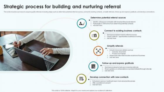 This slide includes a process to acquire quality referrals including steps such as determine potential referral sources, connect to existing contacts, simplify referrals, follow up and express gratitude, and develop connections. Whether you have daily or monthly meetings, a brilliant presentation is necessary. Elevating Sales Networks Strategic Process For Building And Nurturing Referral SA SS V can be your best option for delivering a presentation. Represent everything in detail using Elevating Sales Networks Strategic Process For Building And Nurturing Referral SA SS V and make yourself stand out in meetings. The template is versatile and follows a structure that will cater to your requirements. All the templates prepared by Slidegeeks are easy to download and edit. Our research experts have taken care of the corporate themes as well. So, give it a try and see the results. This slide includes a process to acquire quality referrals including steps such as determine potential referral sources, connect to existing contacts, simplify referrals, follow up and express gratitude, and develop connections.