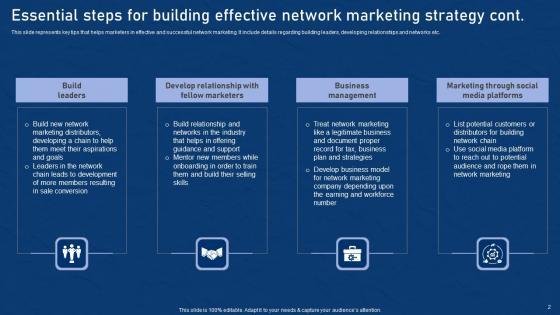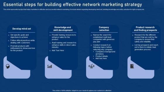 This slide represents key tips that helps marketers in effective and successful network marketing. It include details regarding developing mind set, building knowledge and skills, selection for right company etc. Are you searching for a Comprehensive Guide For Multi Level Essential Steps For Building Effective Network Marketing Structure PDF that is uncluttered, straightforward, and original Its easy to edit, and you can change the colors to suit your personal or business branding. For a presentation that expresses how much effort youve put in, this template is ideal With all of its features, including tables, diagrams, statistics, and lists, its perfect for a business plan presentation. Make your ideas more appealing with these professional slides. Download Comprehensive Guide For Multi Level Essential Steps For Building Effective Network Marketing Structure PDF from Slidegeeks today.