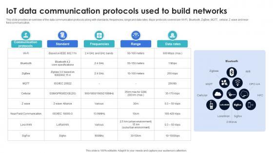 This slide provides an overview of the data communication protocols along with standards, frequencies, range and data rates. Major protocols covered are WI-FI, Bluetooth, ZigBee, MQTT, cellular, Z wave and near- field communication. Create an editable Optimization Of IoT Remote Monitoring IoT Data Communication Protocols Used To Build Networks IoT SS V that communicates your idea and engages your audience. Whether you are presenting a business or an educational presentation, pre-designed presentation templates help save time. Optimization Of IoT Remote Monitoring IoT Data Communication Protocols Used To Build Networks IoT SS V is highly customizable and very easy to edit, covering many different styles from creative to business presentations. Slidegeeks has creative team members who have crafted amazing templates. So, go and get them without any delay. This slide provides an overview of the data communication protocols along with standards, frequencies, range and data rates. Major protocols covered are WI-FI, Bluetooth, ZigBee, MQTT, cellular, Z wave and near- field communication.