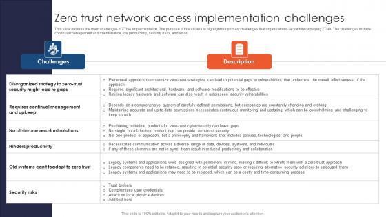 This slide outlines the main challenges of ZTNA implementation. The purpose of this slide is to highlight the primary challenges that organizations face while deploying ZTNA. The challenges include continual management and maintenance, low productivity, security risks, and so on. The best PPT templates are a great way to save time, energy, and resources. Slidegeeks have 100 percent editable powerpoint slides making them incredibly versatile. With these quality presentation templates, you can create a captivating and memorable presentation by combining visually appealing slides and effectively communicating your message. Download Zero Trust Model Zero Trust Network Access Implementation Challenges from Slidegeeks and deliver a wonderful presentation. This slide outlines the main challenges of ZTNA implementation. The purpose of this slide is to highlight the primary challenges that organizations face while deploying ZTNA. The challenges include continual management and maintenance, low productivity, security risks, and so on.