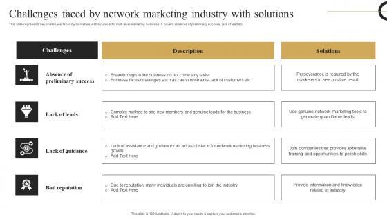 This slide represents key challenges faced by marketers with solutions for multi level marketing business. It covers absence of preliminary success, lack of lead etc. Do you have an important presentation coming up Are you looking for something that will make your presentation stand out from the rest Look no further than Challenges Faced By Network Marketing Industry With Solutions Multi Level Marketing Download Pdf With our professional designs, you can trust that your presentation will pop and make delivering it a smooth process. And with Slidegeeks, you can trust that your presentation will be unique and memorable. So why wait Grab Challenges Faced By Network Marketing Industry With Solutions Multi Level Marketing Download Pdf today and make your presentation stand out from the rest. This slide represents key challenges faced by marketers with solutions for multi level marketing business. It covers absence of preliminary success, lack of lead etc.