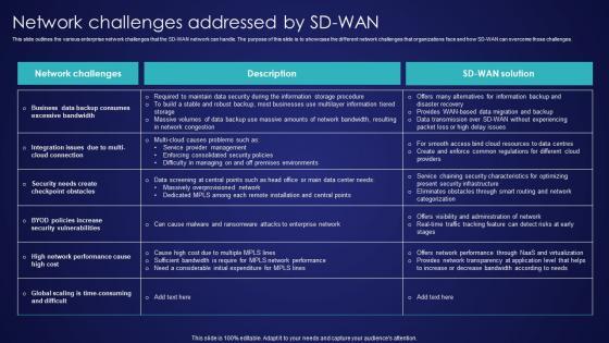 This slide outlines the various enterprise network challenges that the SD-WAN network can handle. The purpose of this slide is to showcase the different network challenges that organizations face and how SD-WAN can overcome those challenges. Want to ace your presentation in front of a live audience Our Virtual WAN Architecture Network Challenges Addressed By SD WAN Themes PDF can help you do that by engaging all the users towards you.. Slidegeeks experts have put their efforts and expertise into creating these impeccable powerpoint presentations so that you can communicate your ideas clearly. Moreover, all the templates are customizable, and easy-to-edit and downloadable. Use these for both personal and commercial use.