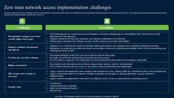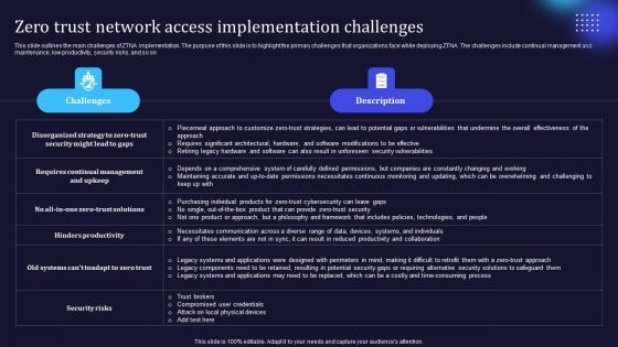 This slide outlines the main challenges of ZTNA implementation. The purpose of this slide is to highlight the primary challenges that organizations face while deploying ZTNA. The challenges include continual management and maintenance, low productivity, security risks, and so on Want to ace your presentation in front of a live audience Our A51 Zero Trust Network Access Implementation Challenges can help you do that by engaging all the users towards you. Slidegeeks experts have put their efforts and expertise into creating these impeccable powerpoint presentations so that you can communicate your ideas clearly. Moreover, all the templates are customizable, and easy-to-edit and downloadable. Use these for both personal and commercial use. This slide outlines the main challenges of ZTNA implementation. The purpose of this slide is to highlight the primary challenges that organizations face while deploying ZTNA. The challenges include continual management and maintenance, low productivity, security risks, and so on