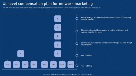 Coming up with a presentation necessitates that the majority of the effort goes into the content and the message you intend to convey. The visuals of a PowerPoint presentation can only be effective if it supplements and supports the story that is being told. Keeping this in mind our experts created Comprehensive Guide For Multi Level Unilevel Compensation Plan For Network Marketing Graphics PDF to reduce the time that goes into designing the presentation. This way, you can concentrate on the message while our designers take care of providing you with the right template for the situation.