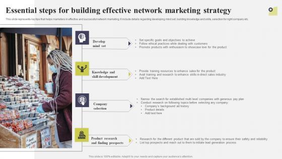 This slide represents key tips that helps marketers in effective and successful network marketing. It include details regarding developing mind set, building knowledge and skills, selection for right company etc. This modern and well-arranged Essential Steps For Building Effective Network Marketing Strategy Multi Level Marketing Topics Pdf provides lots of creative possibilities. It is very simple to customize and edit with the Powerpoint Software. Just drag and drop your pictures into the shapes. All facets of this template can be edited with Powerpoint no extra software is necessary. Add your own material, put your images in the places assigned for them, adjust the colors, and then you can show your slides to the world, with an animated slide included. This slide represents key tips that helps marketers in effective and successful network marketing. It include details regarding developing mind set, building knowledge and skills, selection for right company etc.