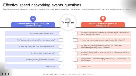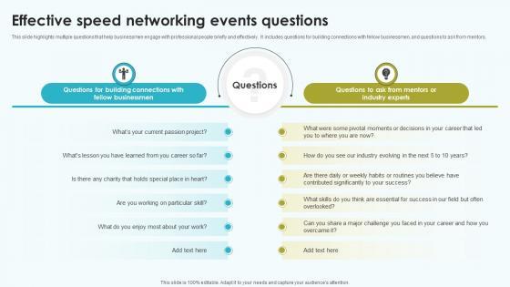 This slide highlights multiple questions that help businessmen engage with professional people briefly and effectively. It includes questions for building connections with fellow businessmen, and questions to ask from mentors. Crafting an eye-catching presentation has never been more straightforward. Let your presentation shine with this tasteful yet straightforward Trade Event Tactics To Boost Effective Speed Networking Events Questions SA SS V template. It offers a minimalistic and classy look that is great for making a statement. The colors have been employed intelligently to add a bit of playfulness while still remaining professional. Construct the ideal Trade Event Tactics To Boost Effective Speed Networking Events Questions SA SS V that effortlessly grabs the attention of your audience Begin now and be certain to wow your customers This slide highlights multiple questions that help businessmen engage with professional people briefly and effectively. It includes questions for building connections with fellow businessmen, and questions to ask from mentors.