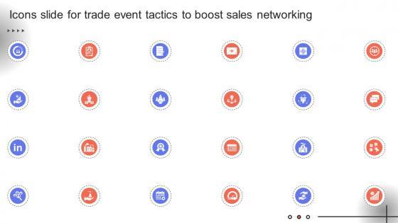 Boost your pitch with our creative Icons Slide For Trade Event Tactics To Boost Sales Networking SA SS V. Deliver an awe-inspiring pitch that will mesmerize everyone. Using these presentation templates you will surely catch everyones attention. You can browse the ppts collection on our website. We have researchers who are experts at creating the right content for the templates. So you do not have to invest time in any additional work. Just grab the template now and use them. Our Icons Slide For Trade Event Tactics To Boost Sales Networking SA SS V are topically designed to provide an attractive backdrop to any subject. Use them to look like a presentation pro.