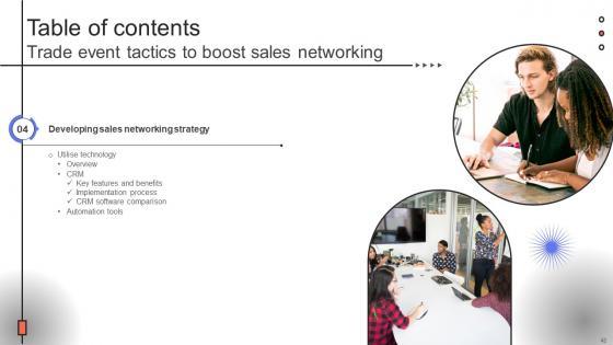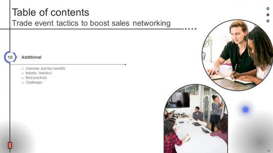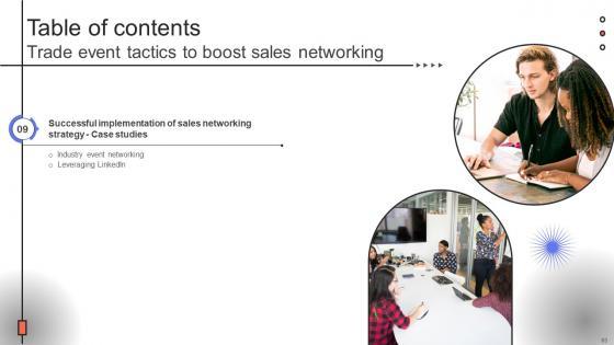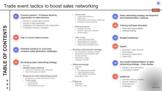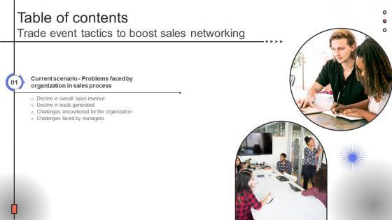 Create an editable Table Of Contents For Trade Event Tactics To Boost Sales Networking SA SS V that communicates your idea and engages your audience. Whether you are presenting a business or an educational presentation, pre-designed presentation templates help save time. Table Of Contents For Trade Event Tactics To Boost Sales Networking SA SS V is highly customizable and very easy to edit, covering many different styles from creative to business presentations. Slidegeeks has creative team members who have crafted amazing templates. So, go and get them without any delay. Our Table Of Contents For Trade Event Tactics To Boost Sales Networking SA SS V are topically designed to provide an attractive backdrop to any subject. Use them to look like a presentation pro.