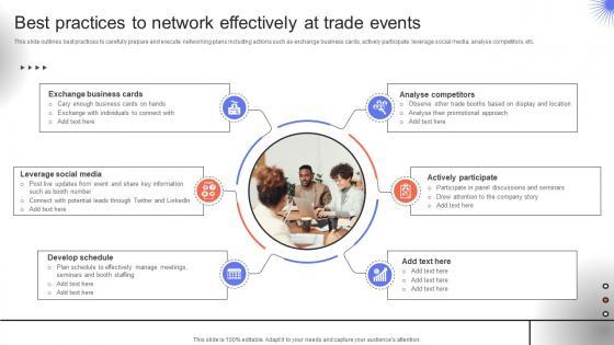 This slide outlines best practices to carefully prepare and execute networking plans including actions such as exchange business cards, actively participate, leverage social media, analyse competitors, etc. Want to ace your presentation in front of a live audience Our Trade Event Tactics To Best Practices To Network Effectively At Trade Events SA SS V can help you do that by engaging all the users towards you. Slidegeeks experts have put their efforts and expertise into creating these impeccable powerpoint presentations so that you can communicate your ideas clearly. Moreover, all the templates are customizable, and easy-to-edit and downloadable. Use these for both personal and commercial use. This slide outlines best practices to carefully prepare and execute networking plans including actions such as exchange business cards, actively participate, leverage social media, analyse competitors, etc.