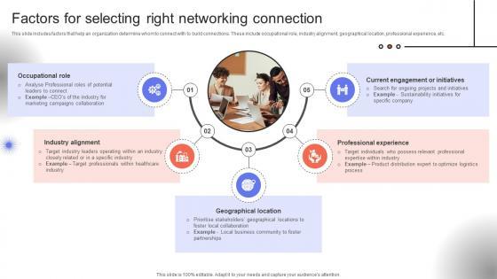This slide includes factors that help an organization determine whom to connect with to build connections. These include occupational role, industry alignment, geographical location, professional experience, etc. Formulating a presentation can take up a lot of effort and time, so the content and message should always be the primary focus. The visuals of the PowerPoint can enhance the presenters message, so our Trade Event Tactics To Boost Factors For Selecting Right Networking Connection SA SS V was created to help save time. Instead of worrying about the design, the presenter can concentrate on the message while our designers work on creating the ideal templates for whatever situation is needed. Slidegeeks has experts for everything from amazing designs to valuable content, we have put everything into Trade Event Tactics To Boost Factors For Selecting Right Networking Connection SA SS V. This slide includes factors that help an organization determine whom to connect with to build connections. These include occupational role, industry alignment, geographical location, professional experience, etc.