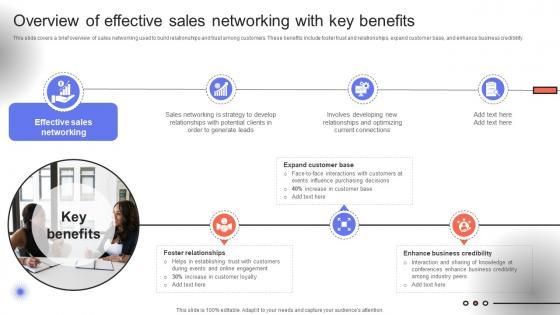 This slide covers a brief overview of sales networking used to build relationships and trust among customers. These benefits include foster trust and relationships, expand customer base, and enhance business credibility. Boost your pitch with our creative Trade Event Tactics To Boost Overview Of Effective Sales Networking With Key Benefits SA SS V. Deliver an awe-inspiring pitch that will mesmerize everyone. Using these presentation templates you will surely catch everyones attention. You can browse the ppts collection on our website. We have researchers who are experts at creating the right content for the templates. So you do not have to invest time in any additional work. Just grab the template now and use them. This slide covers a brief overview of sales networking used to build relationships and trust among customers. These benefits include foster trust and relationships, expand customer base, and enhance business credibility.