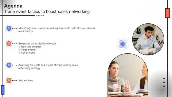 Find a pre-designed and impeccable Agenda Trade Event Tactics To Boost Sales Networking SA SS V. The templates can ace your presentation without additional effort. You can download these easy-to-edit presentation templates to make your presentation stand out from others. So, what are you waiting for Download the template from Slidegeeks today and give a unique touch to your presentation. Our Agenda Trade Event Tactics To Boost Sales Networking SA SS V are topically designed to provide an attractive backdrop to any subject. Use them to look like a presentation pro.