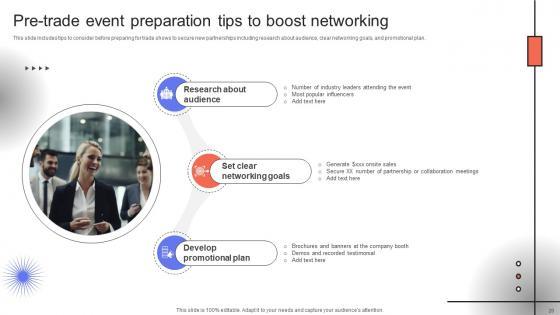 This slide includes tips to consider before preparing for trade shows to secure new partnerships including research about audience, clear networking goals, and promotional plan. Create an editable Elevating Sales Networks Pre Trade Event Preparation Tips To Boost Networking SA SS V that communicates your idea and engages your audience. Whether you are presenting a business or an educational presentation, pre-designed presentation templates help save time. Elevating Sales Networks Pre Trade Event Preparation Tips To Boost Networking SA SS V is highly customizable and very easy to edit, covering many different styles from creative to business presentations. Slidegeeks has creative team members who have crafted amazing templates. So, go and get them without any delay. This slide includes tips to consider before preparing for trade shows to secure new partnerships including research about audience, clear networking goals, and promotional plan.