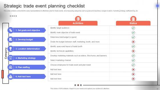 This slide contains a checklist for sales representatives to effectively plan for trade events, encompassing categories such as goals and objectives, budget, location, marketing strategy, staff planning, etc Find highly impressive Elevating Sales Networks Strategic Trade Event Planning Checklist SA SS V on Slidegeeks to deliver a meaningful presentation. You can save an ample amount of time using these presentation templates. No need to worry to prepare everything from scratch because Slidegeeks experts have already done a huge research and work for you. You need to download Elevating Sales Networks Strategic Trade Event Planning Checklist SA SS V for your upcoming presentation. All the presentation templates are 100 percent editable and you can change the color and personalize the content accordingly. Download now This slide contains a checklist for sales representatives to effectively plan for trade events, encompassing categories such as goals and objectives, budget, location, marketing strategy, staff planning, etc