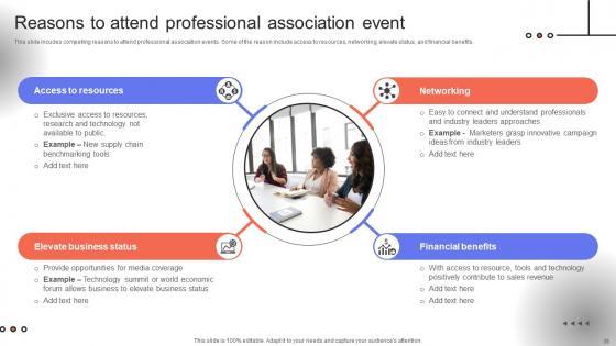 This slide incudes compelling reasons to attend professional association events. Some of the reason include access to resources, networking, elevate status, and financial benefits. There are so many reasons you need a Elevating Sales Networks Reasons To Attend Professional Association Event SA SS V. The first reason is you can not spend time making everything from scratch, Thus, Slidegeeks has made presentation templates for you too. You can easily download these templates from our website easily. This slide incudes compelling reasons to attend professional association events. Some of the reason include access to resources, networking, elevate status, and financial benefits.