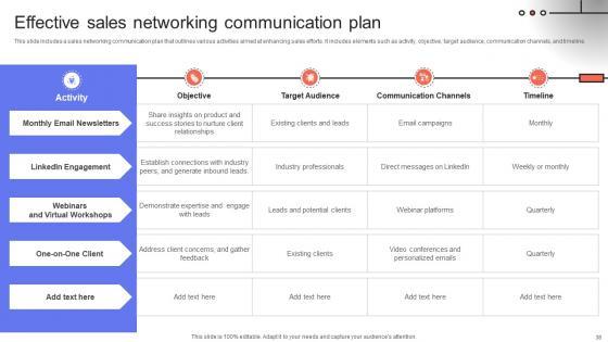 This slide includes a sales networking communication plan that outlines various activities aimed at enhancing sales efforts. It includes elements such as activity, objective, target audience, communication channels, and timeline. Are you in need of a template that can accommodate all of your creative concepts This one is crafted professionally and can be altered to fit any style. Use it with Google Slides or PowerPoint. Include striking photographs, symbols, depictions, and other visuals. Fill, move around, or remove text boxes as desired. Test out color palettes and font mixtures. Edit and save your work, or work with colleagues. Download Trade Event Tactics To Boost Effective Sales Networking Communication Plan SA SS V and observe how to make your presentation outstanding. Give an impeccable presentation to your group and make your presentation unforgettable. This slide includes a sales networking communication plan that outlines various activities aimed at enhancing sales efforts. It includes elements such as activity, objective, target audience, communication channels, and timeline.