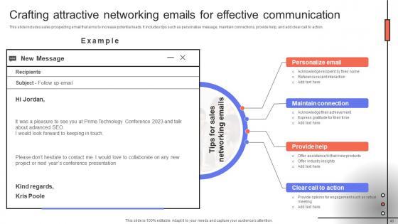 This slide includes sales prospecting email that aims to increase potential leads. It includes tips such as personalise message, maintain connections, provide help, and add clear call to action. Present like a pro with Trade Event Tactics To Boost Crafting Attractive Networking Emails For Effective SA SS V. Create beautiful presentations together with your team, using our easy-to-use presentation slides. Share your ideas in real-time and make changes on the fly by downloading our templates. So whether you are in the office, on the go, or in a remote location, you can stay in sync with your team and present your ideas with confidence. With Slidegeeks presentation got a whole lot easier. Grab these presentations today. This slide includes sales prospecting email that aims to increase potential leads. It includes tips such as personalise message, maintain connections, provide help, and add clear call to action.