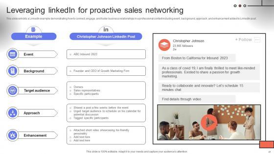 This slide exhibits a LinkedIn example demonstrating how to connect, engage, and foster business relationships in a professional context including event, background, approach, and enhancement added to LinkedIn post. Here you can discover an assortment of the finest PowerPoint and Google Slides templates. With these templates, you can create presentations for a variety of purposes while simultaneously providing your audience with an eye-catching visual experience. Download Trade Event Tactics To Boost Leveraging Linkedin For Proactive Sales Networking SA SS V to deliver an impeccable presentation. These templates will make your job of preparing presentations much quicker, yet still, maintain a high level of quality. Slidegeeks has experienced researchers who prepare these templates and write high-quality content for you. Later on, you can personalize the content by editing the Trade Event Tactics To Boost Leveraging Linkedin For Proactive Sales Networking SA SS V. This slide exhibits a LinkedIn example demonstrating how to connect, engage, and foster business relationships in a professional context including event, background, approach, and enhancement added to LinkedIn post.