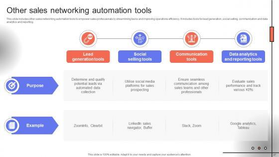This slide includes other sales networking automation tools to empower sales professionals by streamlining tasks and improving operations efficiency. It includes tools for lead generation, social selling, communication and data analytics and reporting. Do you know about Slidesgeeks Trade Event Tactics To Boost Other Sales Networking Automation Tools SA SS V These are perfect for delivering any kind od presentation. Using it, create PowerPoint presentations that communicate your ideas and engage audiences. Save time and effort by using our pre-designed presentation templates that are perfect for a wide range of topic. Our vast selection of designs covers a range of styles, from creative to business, and are all highly customizable and easy to edit. Download as a PowerPoint template or use them as Google Slides themes. This slide includes other sales networking automation tools to empower sales professionals by streamlining tasks and improving operations efficiency. It includes tools for lead generation, social selling, communication and data analytics and reporting.