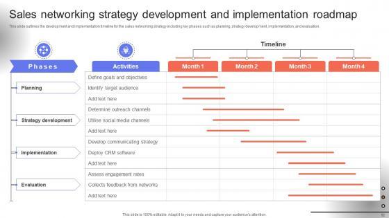 This slide outlines the development and implementation timeline for the sales networking strategy including key phases such as planning, strategy development, implementation, and evaluation. Find highly impressive Trade Event Tactics To Boost Sales Networking Strategy Development And Implementation SA SS V on Slidegeeks to deliver a meaningful presentation. You can save an ample amount of time using these presentation templates. No need to worry to prepare everything from scratch because Slidegeeks experts have already done a huge research and work for you. You need to download Trade Event Tactics To Boost Sales Networking Strategy Development And Implementation SA SS V for your upcoming presentation. All the presentation templates are 100 percent editable and you can change the color and personalize the content accordingly. Download now This slide outlines the development and implementation timeline for the sales networking strategy including key phases such as planning, strategy development, implementation, and evaluation.