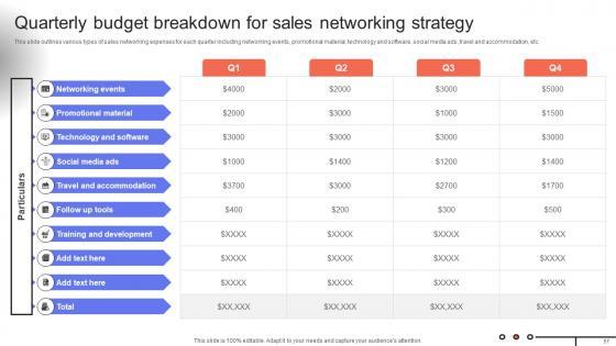 This slide outlines various types of sales networking expenses for each quarter including networking events, promotional material, technology and software, social media ads, travel and accommodation, etc. There are so many reasons you need a Trade Event Tactics To Boost Quarterly Budget Breakdown For Sales Networking Strategy SA SS V. The first reason is you can not spend time making everything from scratch, Thus, Slidegeeks has made presentation templates for you too. You can easily download these templates from our website easily. This slide outlines various types of sales networking expenses for each quarter including networking events, promotional material, technology and software, social media ads, travel and accommodation, etc.