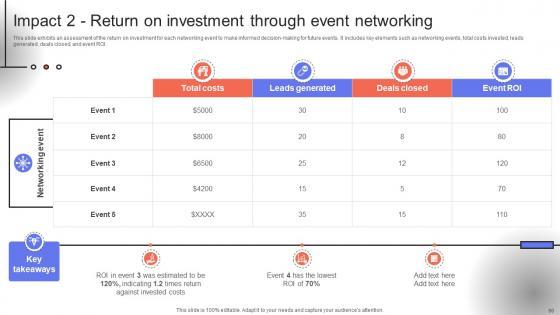 This slide exhibits an assessment of the return on investment for each networking event to make informed decision-making for future events. It includes key elements such as networking events, total costs invested, leads generated, deals closed, and event ROI. Explore a selection of the finest Elevating Sales Networks Impact 2 Return On Investment Through Event SA SS V here. With a plethora of professionally designed and pre-made slide templates, you can quickly and easily find the right one for your upcoming presentation. You can use our Elevating Sales Networks Impact 2 Return On Investment Through Event SA SS V to effectively convey your message to a wider audience. Slidegeeks has done a lot of research before preparing these presentation templates. The content can be personalized and the slides are highly editable. Grab templates today from Slidegeeks. This slide exhibits an assessment of the return on investment for each networking event to make informed decision-making for future events. It includes key elements such as networking events, total costs invested, leads generated, deals closed, and event ROI.