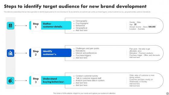 This slide showcases steps that can help organization to identify target audience for new brand launch. Its key elements are customer pain points, purchase triggers, conduct customer survey,, geographical data, audience interests etc. Find highly impressive Steps To Identify Target Audience For New Brand Development Template PDF on Slidegeeks to deliver a meaningful presentation. You can save an ample amount of time using these presentation templates. No need to worry to prepare everything from scratch because Slidegeeks experts have already done a huge research and work for you. You need to download Steps To Identify Target Audience For New Brand Development Template PDF for your upcoming presentation. All the presentation templates are 100 percent editable and you can change the color and personalize the content accordingly. Download now.