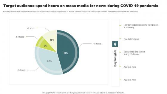 Following slide shows that how much time spend on mass media for news during the covid 19. It leads to increase the screen time of people from less than one hour to more than five hours a day. Showcasing this set of slides titled Target Audience Spend Hours On Mass Media For News During Covid 19 Pandemic Pictures Pdf. The topics addressed in these templates are Target Audience, Mass Media, COVID N19 Pandemic. All the content presented in this PPT design is completely editable. Download it and make adjustments in color, background, font etc. as per your unique business setting. Following slide shows that how much time spend on mass media for news during the covid 19. It leads to increase the screen time of people from less than one hour to more than five hours a day.