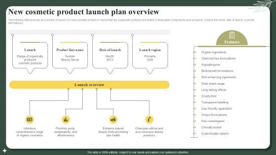 The following slide provides an overview of launch of a new cosmetic product in market that are organically products and tested. It showcases components such as launch, product line name, date of launch, overview and features. Create an editable New Cosmetic Product Launch Plan Overview Successful Launch Ppt Slide that communicates your idea and engages your audience. Whether you are presenting a business or an educational presentation, pre-designed presentation templates help save time. New Cosmetic Product Launch Plan Overview Successful Launch Ppt Slide is highly customizable and very easy to edit, covering many different styles from creative to business presentations. Slidegeeks has creative team members who have crafted amazing templates. So, go and get them without any delay. The following slide provides an overview of launch of a new cosmetic product in market that are organically products and tested. It showcases components such as launch, product line name, date of launch, overview and features.