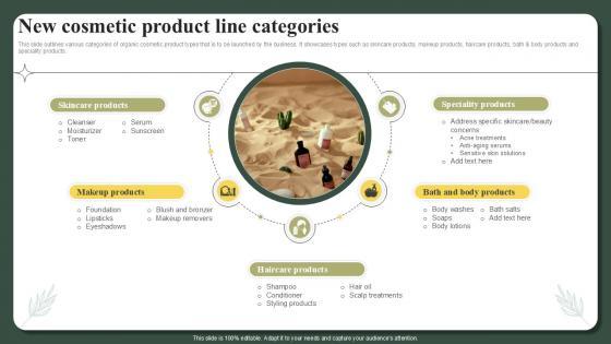 This slide outlines various categories of organic cosmetic product types that is to be launched by the business. It showcases types such as skincare products, makeup products, haircare products, bath and body products and speciality products. Slidegeeks is one of the best resources for PowerPoint templates. You can download easily and regulate New Cosmetic Product Line Categories Successful Launch Ppt Presentation for your personal presentations from our wonderful collection. A few clicks is all it takes to discover and get the most relevant and appropriate templates. Use our Templates to add a unique zing and appeal to your presentation and meetings. All the slides are easy to edit and you can use them even for advertisement purposes. This slide outlines various categories of organic cosmetic product types that is to be launched by the business. It showcases types such as skincare products, makeup products, haircare products, bath and body products and speciality products.